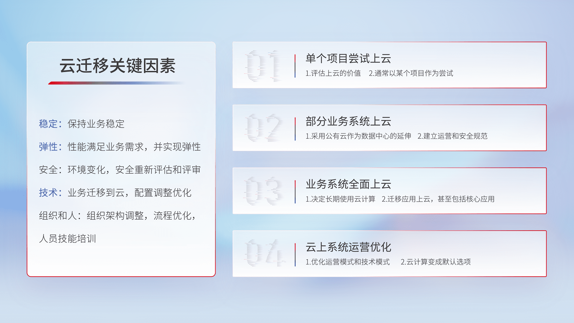 结合实际业务,,从规划设计、、云平台选型、、、、云原生改造、、、数据迁移、、、、集成交付,,,,迁移全过程为客户识别最佳上云路径,,,,做好风险识别管理,,,,设计网络架构、、、身份权限、、、、安全审计合规、、、、操作审计、、、、日志审计、、监控告警策略、、多站点容灾设计等,,,对云上基础设施进行整体规划,,提升IT治理水平,,以满足弹性、、、高可用、、、高性能的需求。。