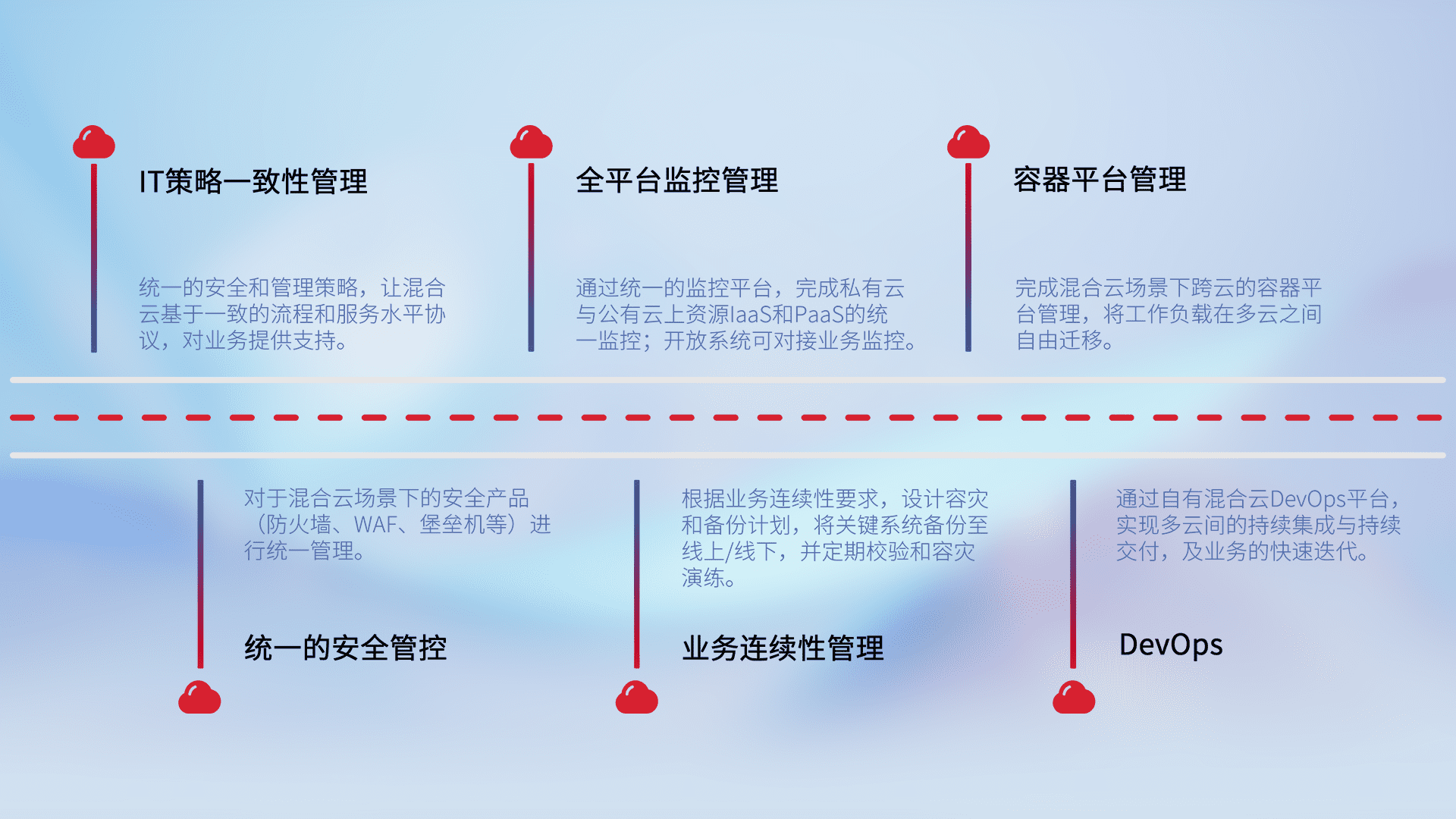 通过多云纳管,,,,以统一的资源数据模型把客户的云资源进行抽象和封装,,,,进而实现对多云资源的统一操作,,,保障云资源管理的可靠性、、稳定性与可用性。。。量身定制化运维内容,,,,配置、、开发运维、、补丁管理、、备份、、、监控、、、、认证和访问管理、、、审计和日常巡检等,,保障在用云过程中的可靠度,,,,稳定度以及高可用率。。。。